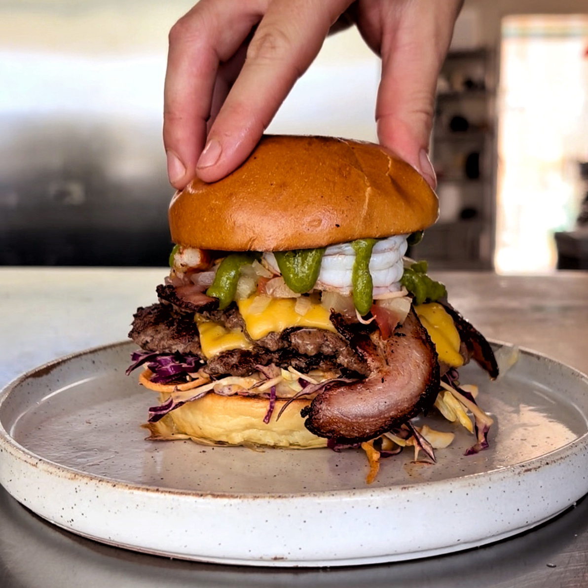 Sink your teeth into our Surf ‘n’ Turf Burger stacked with local Exmouth Gulf prawns, double beef, double cheese, bacon, coleslaw, pineapple salsa, salsa verde, lemon — all served in a buttery toasted bun with chips. Pair it with a cold drink, enjoy some live tunes, and settle in for the ultimate laid-back Saturday lunch .